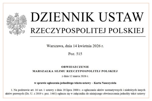czytaj więcejW Dzienniku Ustaw ukazało się obwieszczenie Marszałka Sejmu RR w sprawie ogłoszenia jednolitego tekstu ustawy – Karta Nauczyciela (Dz.U. z 2026 r.…