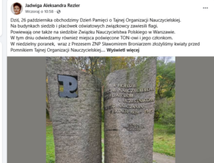 W niedzielę delegacja ZNP z prezesem Sławomirem Broniarzem i wiceprezes ZG ZNP Aleksandrą Jadwigą Rezler na czele złożyła kwiaty przed Pomnikiem Tajnej Organizacji Nauczycielskiej na warszawskim Powiślu.