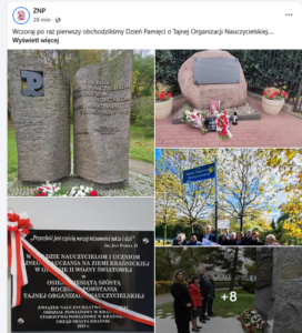 Członkowie Oddziału ZNP w Poznaniu wraz z prezesem Okręgu Wielkopolskiego ZNP Małgorzatą Kowzan oraz członkiem sekretariatu Zarządu Okręgu Hanną Czerniak spotkali się na skwerze Tajnej Organizacji Nauczycielskiej aby uczcić pamięć nauczycielek i nauczycieli, którzy z narażeniem życia prowadzili tajne nauczanie w czasie okupacji niemieckiej w latach 1939-1945.