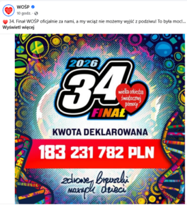 Przypomnijmy, że w 2025 roku przed północą, gdy WOŚP grała na rzecz onkologii i hematologii dziecięcej, finałowy licznik zatrzymał się na kwocie 178,5 mln zł. Ostateczna kwota była znacznie wyższa i ponownie rekordowa – 289 mln zł. W sumie przez 34 lat działalności fundacja zebrała ponad 2,6 mld zł, za co kupiła ponad 80 tys. urządzeń dla publicznych szpitali w całej Polsce.