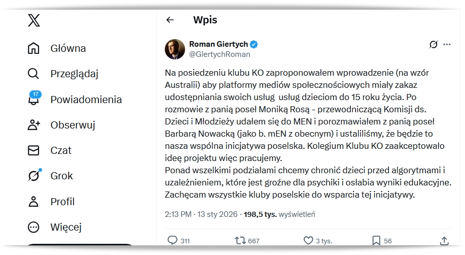 Nie będzie to jednak projekt MEN, lecz inicjatywa poselska. Chodzi o ochronę najmłodszych przed niebezpiecznymi treściami w internecie, ograniczeniem szkodliwego wpływu mediów społecznościowych na zdrowie psychiczne, a także o zapobieganie uzależnieniu od korzystania z social mediów.