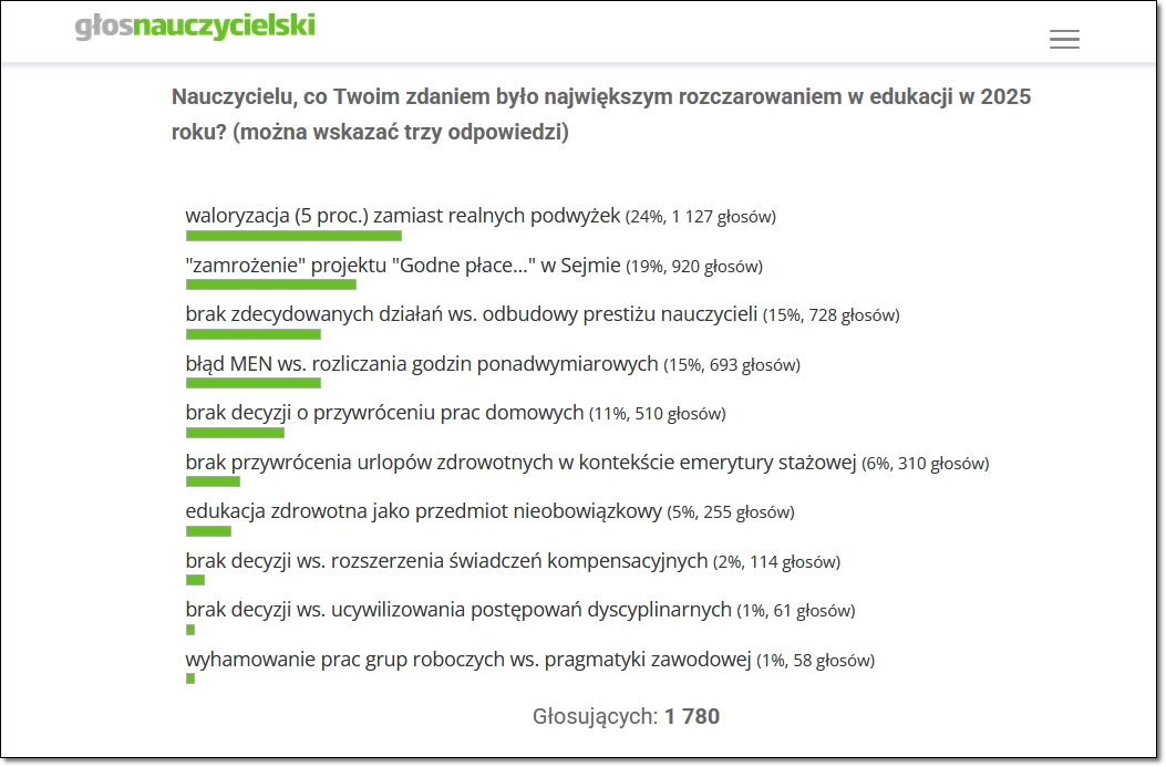 Brak realizacji przez rządzących obietnic w sprawie wynagrodzeń nauczycieli to największe rozczarowanie w edukacji w ubiegłym roku. Znamy już wyniki ankiety Głosu Nauczycielskiego z udziałem blisko 2 tys. nauczycieli. Wnioski? Płace! Płace, płace i jeszcze raz płace! To priorytet oświatowy w 2026 r. i lekcja do odrobienia dla rządzących.