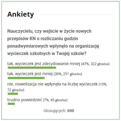 Znamy wyniki ankiety Głosu Nauczycielskiego w sprawie wycieczek szkolnych w kontekście wadliwych przepisów o rozliczaniu godzin ponadwymiarowych. Odpowiedzi blisko 700 nauczycieli są jednoznaczne. Ponad 80 proc. głosujących mówi, że chaos w rozliczaniu ponadwymiarówek wpłynął na zmniejszenie liczby wycieczek. Blisko połowa uczestników głosowania przyznaje, że wycieczek jest zdecydowanie mniej. Wszystko przez złe przepisy o rozliczaniu ponadwymiarówek. Nauczyciele tracą wynagrodzenia za zajęcia, które nie odbyły się z powodu udziału uczniów w wycieczce lub w innych usprawiedliwionych przypadkach. Dlatego w wielu szkołach postanowiono – rezygnujemy z wycieczek, by nie pozbawiać koleżanek i kolegów wynagrodzenia za godziny ponadwymiarowe.