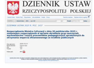 Zgodnie ze znowelizowanym rozporządzeniem, nauczyciele mogą składać wnioski od dzisiaj, 22 października 2025 r. przez 30 dni. Organy prowadzące szkoły winny niezwłocznie po upływie tych 30 dni złożyć zbiorowy wniosek do Ministerstwa Cyfryzacji, które na bieżąco będzie przesyłało kody uprawnionym nauczycielom.