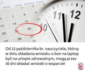 Nauczyciele, którzy w dniu składania wniosku o bon na laptop, przebywali na urlopach dla poratowania zdrowia, mogą od 22 października br. przez 30 dni składać wnioski! W środę weszło w życie Rozporządzenie Ministra Cyfryzacji ws. grup nauczycieli, wychowawców i innych pracowników pedagogicznych uprawnionych do otrzymania wsparcia sfinansowanego ze środków publicznych.