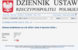 Ustawa budżetowa na 2026 rok została ogłoszona w Dzienniku Ustaw 20 stycznia (Poz 62.)