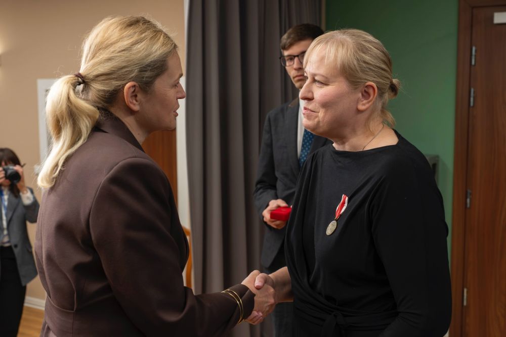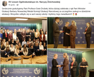 „Serdecznie gratulujemy Pani Profesor Ewie Drobek, która dzisiaj odebrała z rąk Pani Minister Edukacji Barbary Nowackiej Medal Komisji Edukacji Narodowej za szczególne zasługi w dziedzinie edukacji. Wszystko odbyło się w auli naszej szkoły i byliśmy tego świadkami!” – cieszą się na Facebooku uczniowie Żmichowskiej.