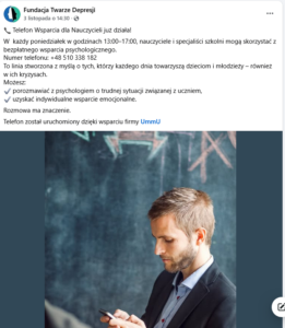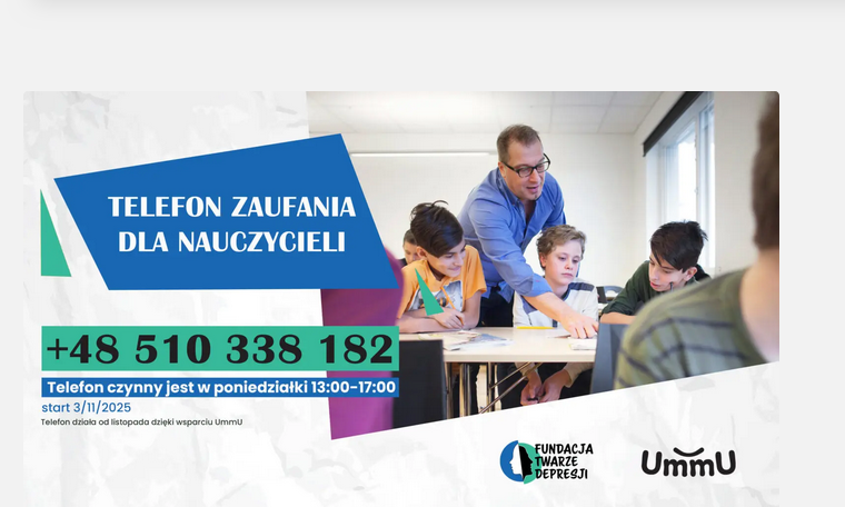 W ramach programu „Twarze Depresji dla Szkół”, skierowanego do nauczycieli szkół podstawowych i ponadpodstawowych, który ma na celu poprawę stanu zdrowia psychicznego uczniów, Fundacja Twarze Depresji uruchomiła 3 listopada bezpłatny telefon zaufania dla nauczycieli.