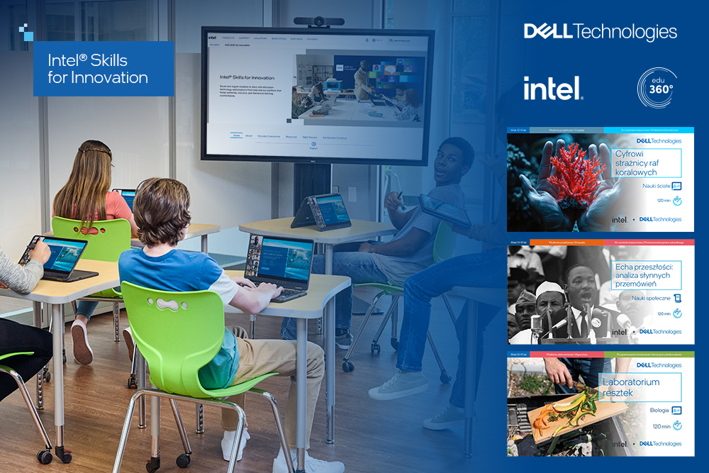 szybko zyskało uznanie oraz wsparcie ze strony liderów branży. Dużą rolę odgrywa tu firma Dell Technologies, która od lat ściśle współpracuje z Intelem, aby dostarczać rozwiązania zoptymalizowane pod kątem potrzeb sektora edukacyjnego. Owocem współpracy w ramach programu Intel® Skills for Innovation są pakiety Dell Starter Packs, przygotowane właśnie z inicjatywy Dell Technologies. Scenariusze “Cyfrowi strażnicy raf koralowych”, “Echa przeszłości – analiza słynnych przemówień” czy “Laboratorium resztek” to konspekty nowatorskich zajęć, na których uczniowie zdobywają wiedzę poprzez doświadczanie i projektowanie, z wykorzystaniem nowoczesnej technologii cyfrowej, w tym sztucznej inteligencji.