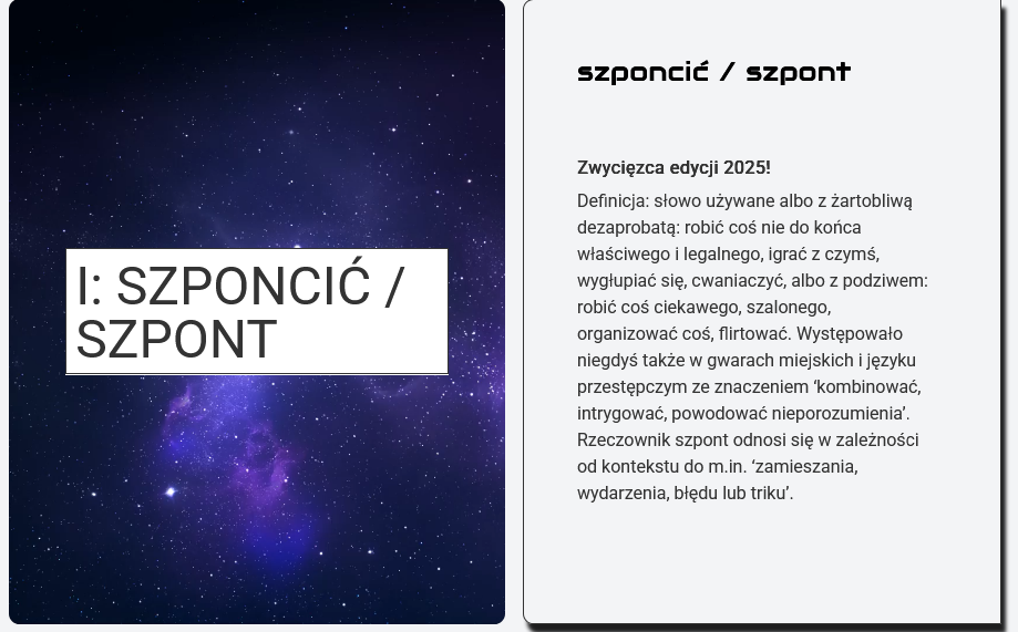 W jubileuszowej, 10. edycji plebiscytu na Młodzieżowe Słowo Roku najwięcej głosów zebrało słowo „szponcić” (szpont), którego używa się albo w celu wyrażenia dezaprobaty (w znaczeniu „robić coś niewłaściwego, złego, szkodliwego, igrać z czymś, wygłupiać się, cwaniaczyć”), albo podziwu („robić coś ciekawego, szalonego, organizować coś, flirtować”).