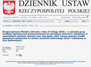W Dzienniku Ustaw ukazało się rozporządzenie Ministra Zdrowia z dnia 16 lutego 2026 r. „w sprawie grup środków spożywczych przeznaczonych do sprzedaży dzieciom i młodzieży w jednostkach systemu oświaty oraz wymagań, jakie muszą spełniać środki spożywcze stosowane w ramach żywienia zbiorowego dzieci i młodzieży w tych jednostkach”.