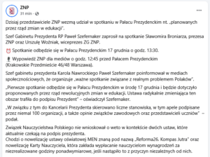 – Związek Nauczycielstwa Polskiego nie wnioskował o zawetowanie dwóch ustaw, które aktualnie czekają na podpis prezydenta – powiedział prezes ZNP Sławomir Broniarz przed spotkaniem w Pałacu Prezydenckim, które ma dotyczyć „planowanych przez rząd zmian w edukacji”. Chodzi o nowelizację ustawy oświatowej MEN znaną pod nazwą „Reforma26. Kompas Jutra oraz nowelizację Karty Nauczyciela, która zakłada wypłacanie nauczycielom wynagrodzeń za niezrealizowane godziny ponadwymiarowe, jeśli nastąpiło to z przyczyn niezależnych od nich. O podpisanie reformy „Kompas Jutra” zaapelowały do Karola Nawrockiego koalicja SOS dla Edukacji oraz Akcja Uczniowska.
