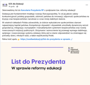 SOS dla Edukacji (Sieć Organizacji Społecznych dla Edukacji) w liście do prezydenta Karola Nawrockiego z apelem o podpisanie nowelizacji ustawy Prawo oświatowe podkreśliła, że u podstaw jej stanowiska leży interes państwa rozumiany systemowo: długofalowa zdolność Polski do prowadzenia polityki rozwojowej opartej na kapitale ludzkim i społecznym, konkurencyjność gospodarki oraz odporność społeczna i obronna.