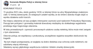 „Jesteśmy wstrząśnięci tragedią w Jeleniej Górze. Myślami i sercem jesteśmy z rodziną, bliskimi oraz społecznością szkolną dotkniętą tym niewyobrażalnym zdarzeniem. Pozostajemy w kontakcie z lokalnymi władzami i Kuratorem Oświaty” – napisano w specjalnym komunikacie MEN po zabójstwie 11-letniej dziewczynki w Jeleniej Górze. Na jaw wychodzą nowe, wstrząsające fakty dotyczące tej zbrodni. Sąd rodzinny wyraził zgodę na przesłuchanie 12-latki zatrzymanej ws. zabójstwa 11-letniej dziewczynki. – Kwestie bezpieczeństwa są coraz ważniejsze (…) nie możemy spać, musimy podjąć działania – komentowała minister edukacji Barbara Nowacka.