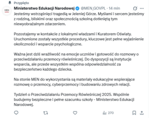 „W związku z tragicznymi wydarzeniami w Jeleniej Górze informuję, że szpital MSWiA deleguje 16 psychologów do wsparcia uczniów oraz kadry szkolnej” – przekazał. „Nie wpłynie to negatywnie na funkcjonowanie szpitala ani na ciągłość udzielania świadczeń” – dodał.