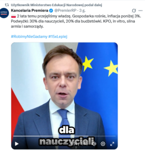 „2 lata temu przejęliśmy władzę. Gospodarka rośnie, inflacja poniżej 3%. Podwyżki: 30% dla nauczycieli, 20% dla budżetówki. KPO, in vitro, silna armia i samorządy” – chwali się na okolicznościowym filmiku minister finansów Andrzej Domański.