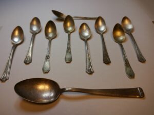 4. Sztućce żydowskich letników z Łodzi. Sztućce żydowskich letników z Łodzi, którzy co roku spędzali wakacje u polskiej rodziny w Orchowie (pow. Łask). Ponieważ przestrzegali koszerności, przywozili własne sztućce. Latem 1939 r. rodzina wynajęła kwaterę po raz ostatni. Sztućce zostały podarowane Muzeum POLIN. Źródło: Muzeum Historii Żydów Polskich POLIN.