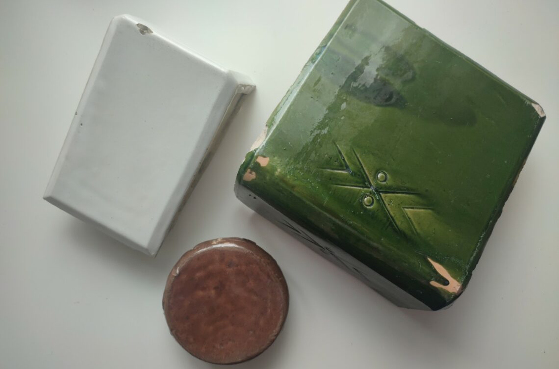 1. Kafle z rozebranych żydowskich domów w Biłgoraju. W 1939 r., duża część miasteczka spłonęła, a cegły i kafle z częściowo zniszczonych żydowskich domów posłużyły niemieckim okupantom do budowy pieców w siedzibie Gestapo. Źródło: przechowane.org