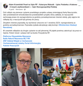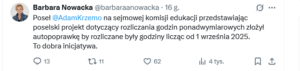 „Poseł Adam Krzemiński na sejmowej komisji edukacji przedstawiając poselski projekt dotyczący rozliczania godzin ponadwymiarowych złożył autopoprawkę by rozliczane były godziny licząc od 1 września 2025. To dobra inicjatywa” – pochwaliła na platformie X szefowa MEN Barbara Nowacka.