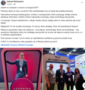 W dniach 21-23 stycznia odbywa się w Londynie kolejna edycja Bett Show czyli największych targów technologii edukacyjnych. Wśród zaproszonych gości znalazło się zacne grono Nauczycieli Roku: Agnieszka Kopacz (2025), Gabriel Wołosewicz (2024), Radosław Potrac (2023) i Zyta Czechowska (2019).