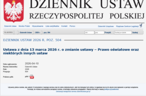 Ustawa z dnia 13 marca 2026 r. o zmianie ustawy – Prawo oświatowe oraz niektórych innych ustaw, która ma pomóc ratować małe szkoły przed likwidacją w sytuacji niżu demograficznego została opublikowana w Dzienniku Ustaw (poz. 504) z datą 10 kwietnia. Ustawa wejdzie w życie po upływie 14 dni od dnia ogłoszenia, czyli 24 kwietnia.