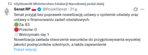 Senat nie zaproponował poprawek do nowelizacji ustaw o systemie oświaty i finansowaniu zadań oświatowych. Przepisy zwiększają środki na zakup podręczników dla uczniów szkół podstawowych oraz podnoszą opłaty dla wydawców ubiegających się o dopuszczenie podręcznika.