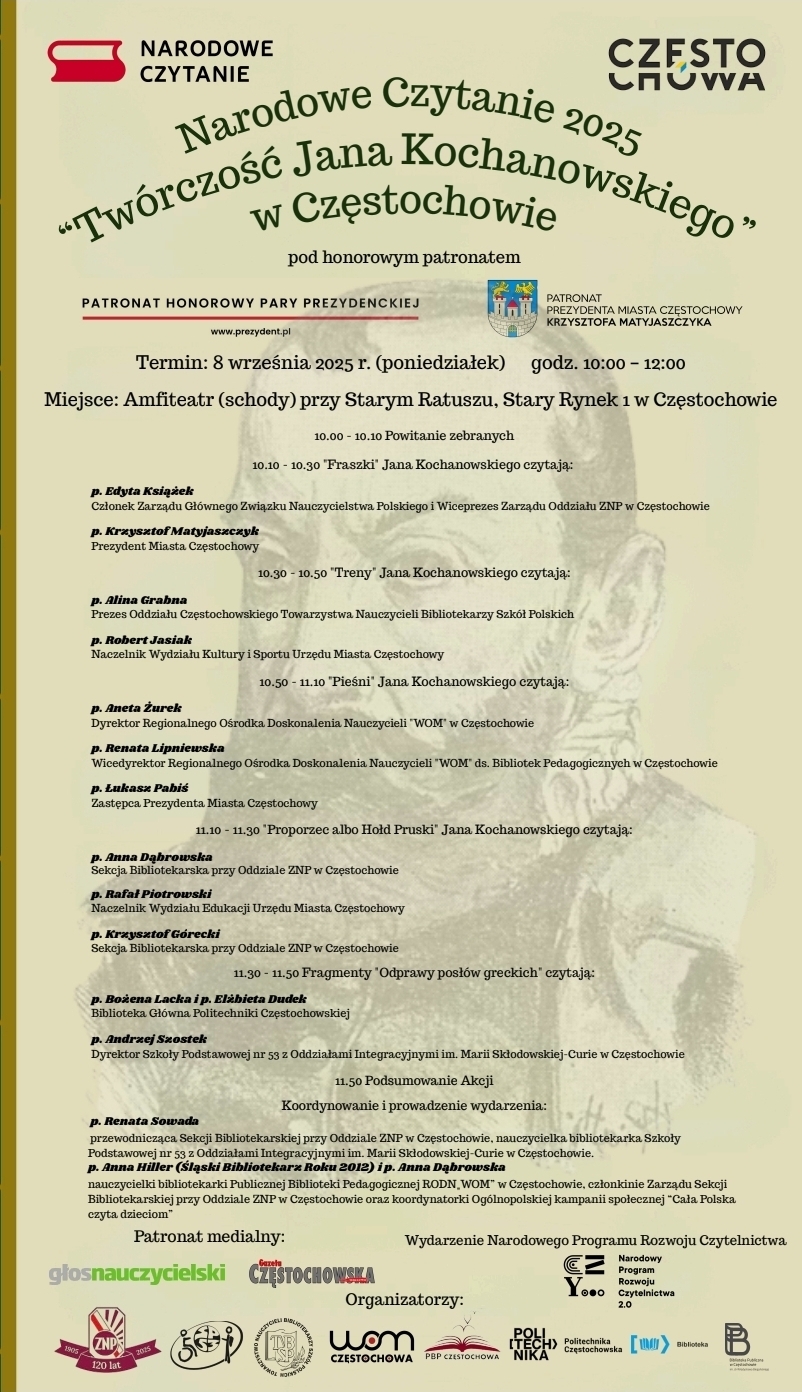 W tym roku jednym z wielu wydarzeń organizowanych w ramach wspomnianej akcji jest Narodowe Czytanie w Częstochowie „Twórczość Jana Kochanowskiego”. Do wspólnego czytania poezji Mistrza z Czarnolasu oraz świętowania Światowego Dnia Umiejętności Czytania/ Międzynarodowego Dnia Alfabetyzacji zaprosili uczniów wraz z nauczycielami organizatorzy tego ciekawego wydarzenia.
