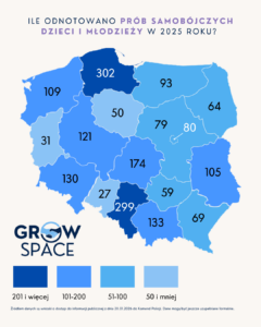 Dane Komendy Głównej Policji zostały pozyskane za pomocą prawa do informacji publicznej i przedstawiają obraz na dzień 20 stycznia 2026. Informacje przekazane przez KGP pokazują, że w całym 2025 roku (od stycznia do grudnia) odnotowanych zostało 1925 prób samobójczych dzieci i młodzieży oraz 161 samobójstw (prób, które zakończyły się zgonem). Najwięcej prób miało miejsce w woj. pomorskim – 302 przypadki oraz w woj. śląskim – 299 przypadków. Najmniej w woj. lubuskim – 31 osób młodych i w woj. opolskim – 27 osób młodych.