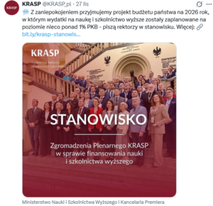 „Z zaniepokojeniem przyjmujemy projekt budżetu państwa na 2026 rok, w którym wydatki na naukę i szkolnictwo wyższe zostały zaplanowane na poziomie nieco ponad 1% PKB. Jest to najniższy wskaźnik od początku reformy zapoczątkowanej ustawą z 2018 roku. Co więcej, zaprojektowane nakłady są kilkukrotnie niższe od średnich wydatków w państwach należących do OECD – czytamy m.in. w stanowisku Konferencji Rektorów Akademickich Szkół Polskich (KRASP) ws. finansowania nauki i szkolnictwa wyższego.