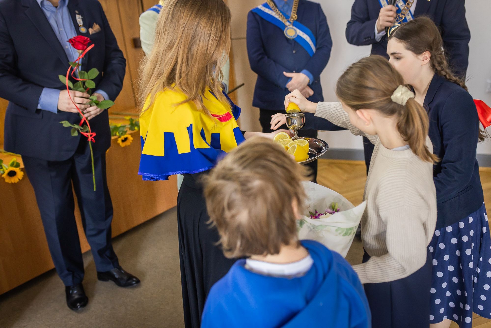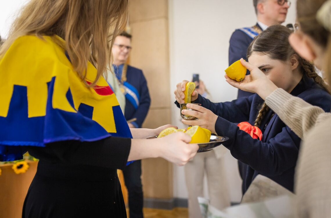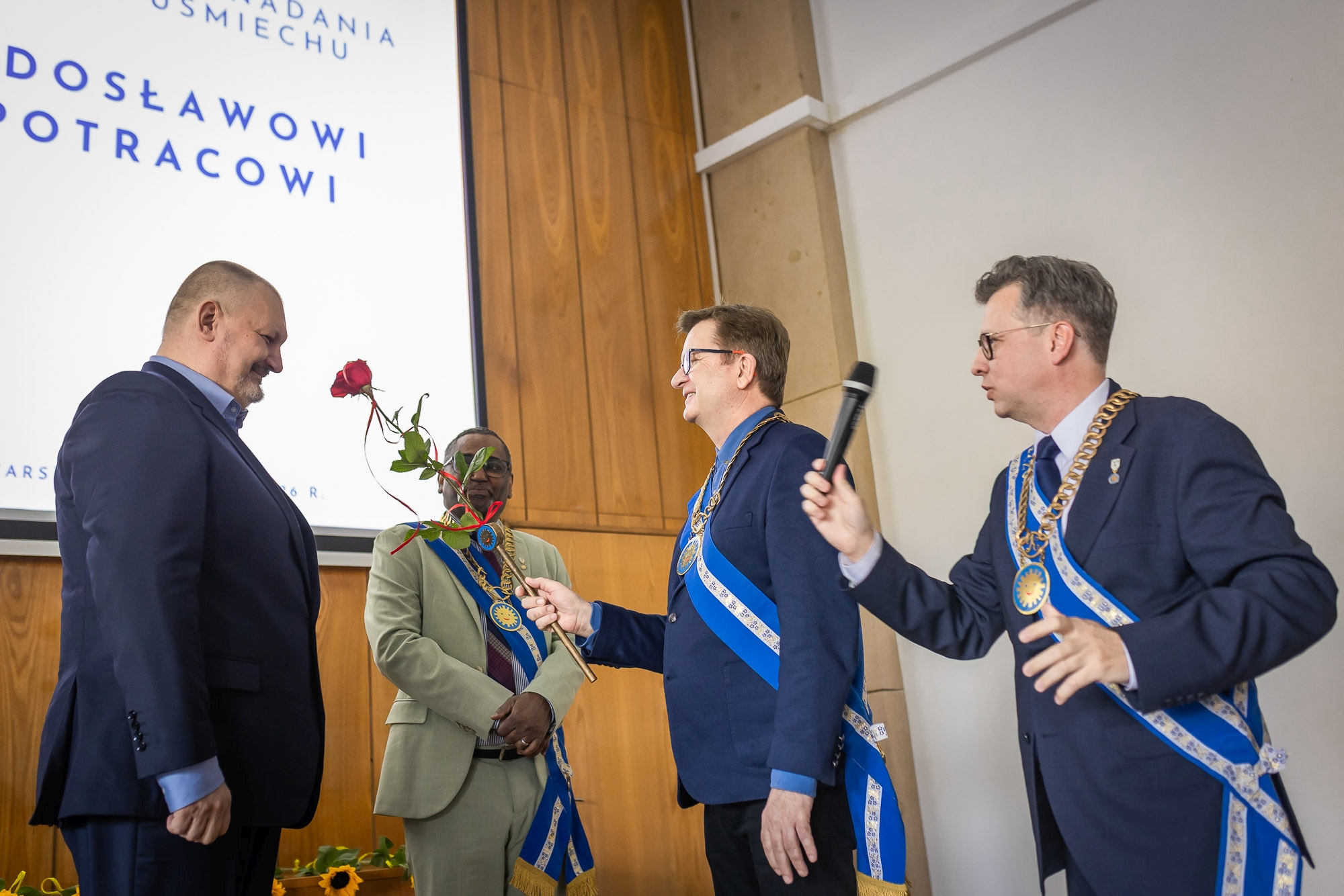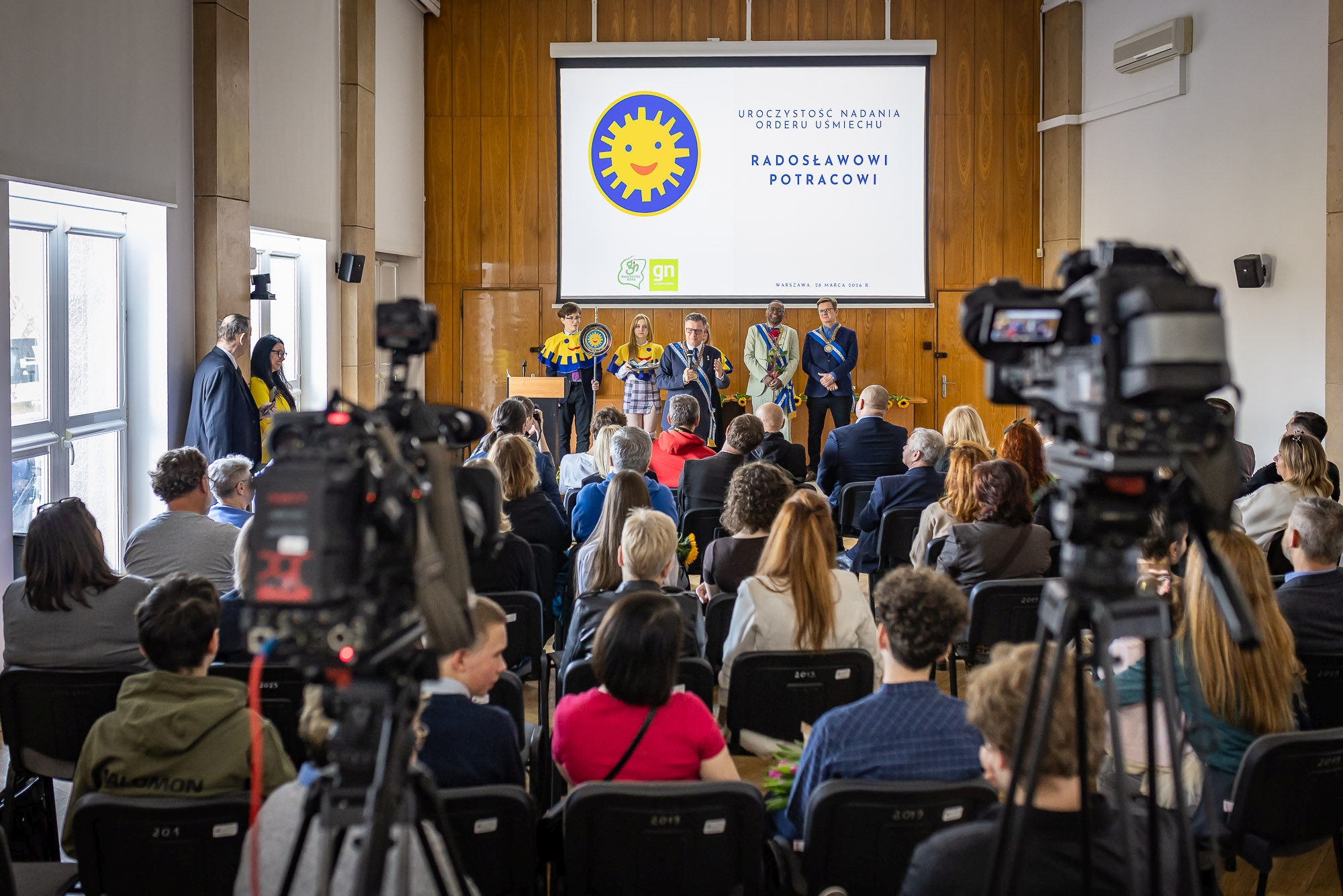 Było tradycyjne picie soku z cytryny, wyciśniętego przez dzieci, były łzy wzruszenia, podziękowania i gratulacje. Składali je Kawalerowi Orderu Uśmiechu jego goście, którzy licznie przybyli 28 marca do sali kolumnowej siedziby ZG ZNP. Po raz pierwszy w historii do grona odznaczonych najbardziej słonecznym z orderów dołączył Nauczyciel Roku i chyba po raz pierwszy taki ceremoniał odbył się w gmachu przy ul. Juliana Smulikowskiego. Gmach ten od blisko 100 lat służy nauczycielom, ale takiego wydarzenia jeszcze nie gościł! Uroczystość pasowania Radosława Potraca na 1096 Kawalera Orderu Uśmiechu zorganizowali Nauczyciele Roku oraz Głos Nauczycielski.