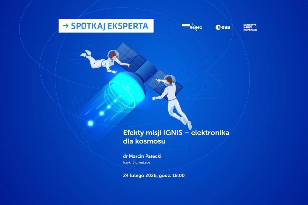 Misja IGNIS była przełomem dla polskiej nauki i branży kosmicznej. Jak wykorzystać to doświadczenie, by zachęcić uczniów i uczennice do myślenia o karierze w sektorze kosmicznym? Centrum Nauki Kopernik i ESERO-Polska zapraszają 24 lutego 2026 roku o godz. 18.00 na bezpłatne webinarium online z dr. Marcinem Pateckim z firmy SigmaLabs, współtwórcą eksperymentu realizowanego na pokładzie Międzynarodowej Stacji Kosmicznej (ISS).