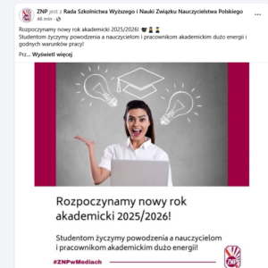 „Rozpoczynamy nowy rok akademicki 2025/2026! Studentom życzymy powodzenia a nauczycielom i pracownikom akademickim dużo energii i godnych warunków pracy!” – czytamy na Facebooku ZNP.