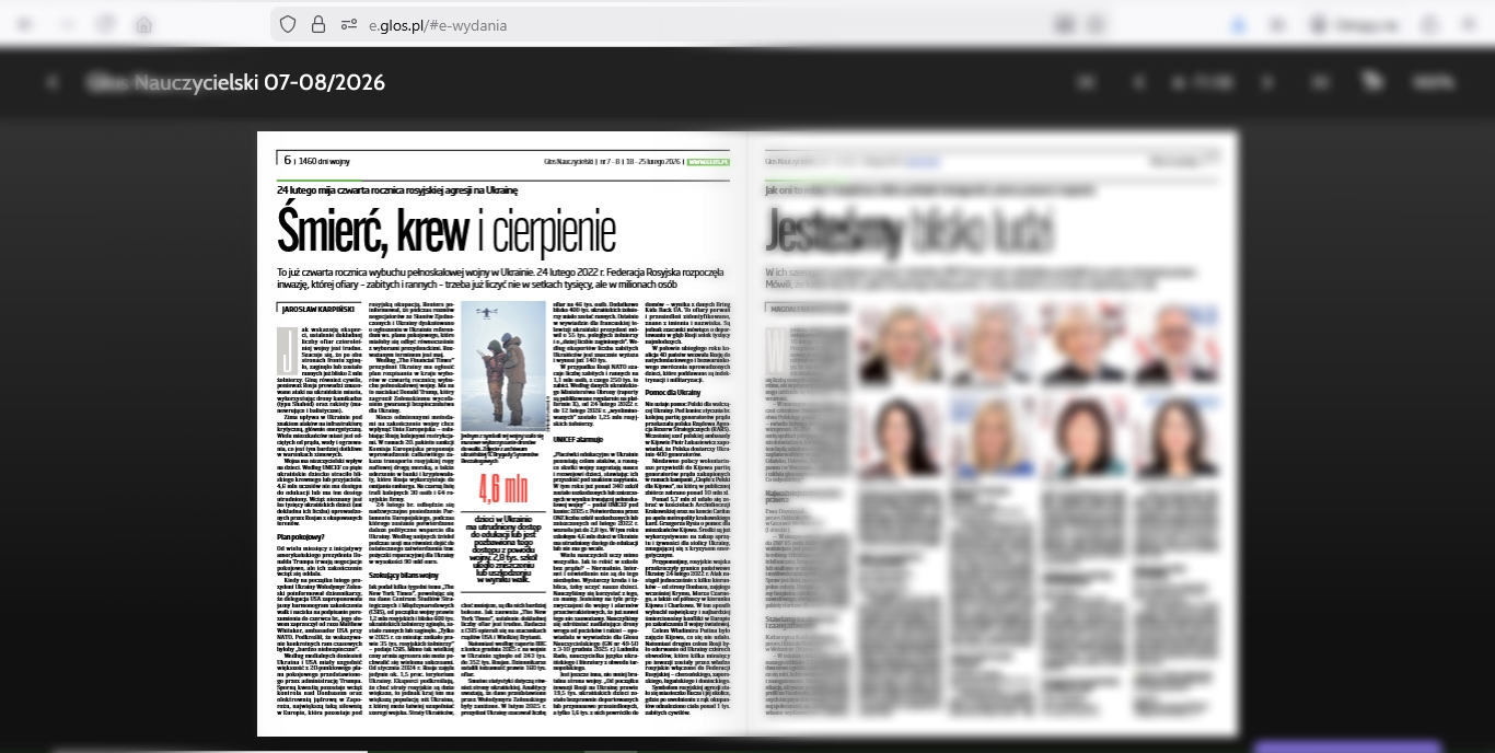 O czwartej rocznicy rosyjskiej agresji (1460 dniach wojny) na Ukrainę obszernie piszemy w ostatnim Głosie Nauczycielskim (nr. 7-8 z 18-25 lutego).