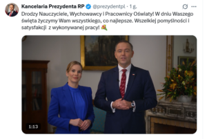 Życzenia nauczycielom złożyła też para prezydencka. „Z okazji Państwa święta serdecznie pozdrawiamy wszystkich pedagogów. Życzymy Państwu satysfakcji z rozwoju zawodowego, dobrej energii do pracy z uczniami i radości z ich osiągnieć. Nie mamy wątpliwości, że dobra polska szkoła jest miejscem, w którym wykuwa się przyszłość Polski. Uczeń, który z niej wychodzi, powinien czuć dumę z bycia Polakiem, znać i szanować polską historię i kulturę. Nie będzie normalnej Polski bez normalnej szkoły. Mogą ją tworzyć tylko dobrzy nauczyciele” – słyszymy m. in. na nagraniu.