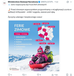 W poniedziałek, 2 lutego, rozpoczyna się druga tura ferii zimowych w roku szkolnym 2025/2026, która potrwa do 15 lutego. Na wypoczynek wyjadą uczniowie z województw dolnośląskiego, kujawsko-pomorskiego, łódzkiego, zachodniopomorskiego, małopolskiego i opolskiego. W sumie w tej turze z zimowego wypoczynku skorzysta ponad 1,6 mln uczniów.