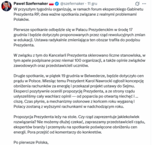 Szef gabinetu prezydenta Nawrockiego Paweł Szefernaker poinformował w mediach społecznościowych, że organizuje „ważne spotkanie związane z realnym problemem Polaków”.