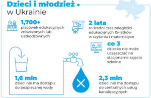 Z danych UNICEF wynika, że ponad 1,7 tys. placówek edukacyjnych zostało uszkodzonych lub zniszczonych, a co czwarte dziecko nie może uczęszczać na zajęcia stacjonarne w pełnym wymiarze.