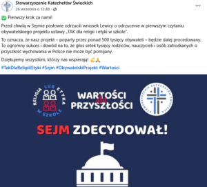 Sejm skierował do dalszych prac obywatelski projekt ustawy „Tak dla religii i etyki w szkole”, który zakłada wprowadzenie do szkół dwóch obowiązkowych lekcji religii lub etyki w tygodniu. Za dalszymi pracami zagłosowali posłowie PiS, Konfederacji oraz PSL-TD, a także część posłów Polska2050-TD. Posłowie Lewicy zgłosili wcześniej wniosek o odrzucenie go w całości, który nie został jednak przyjęty.
