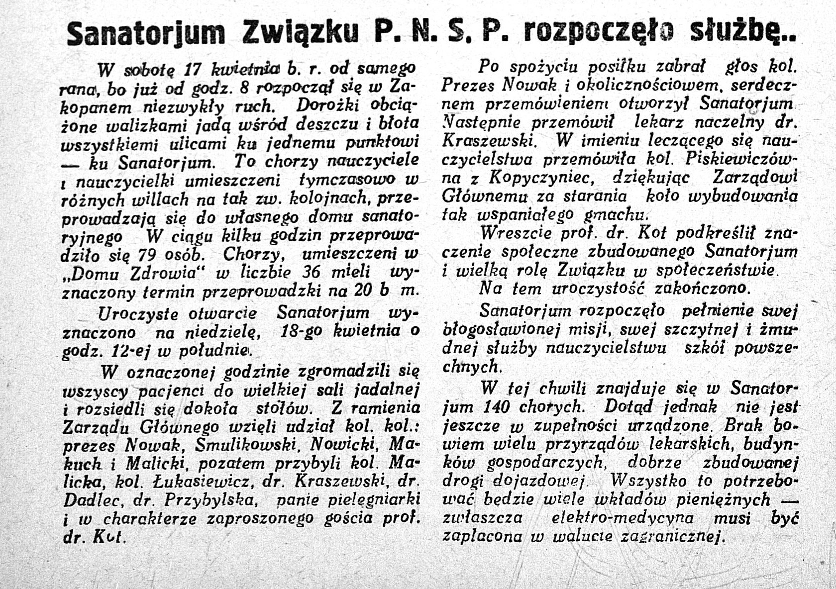 „W sobotę 17 kwietnia br. od samego rana, bo już od godz. 8 rozpoczął się w Zakopanem niezwykły ruch” – tak relacjonował Głos Nauczycielski podniosły moment uruchomienia działalności Sanatorium ZPNSP na Ciągłówce. „Dorożki obciążone walizkami jadą wśród deszczu i błota wszystkiemi ulicami ku jednemu punktowi – ku Sanatorjum” (pisownia oryginalna) – pisał Głos (nr 9 z 25 kwietnia 1926 r.).