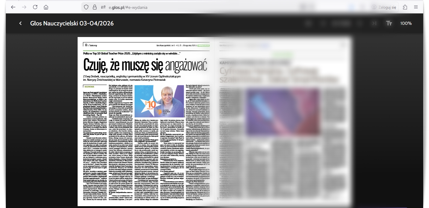 – Uznanie to jest dla mnie codzienna praca z moimi uczniami, to, że oni widzą we mnie potencjał i zgłaszają mnie do konkursów. Ja sama, osobiście zgłosiłam się tylko do jednego z nich, do Akademii Kobiet Skutecznych 2021, i zostałam laureatką tego plebiscytu w kategorii nauka i edukacja. Pozostałe konkursy to jest ich inicjatywa. Moich uczniów. Dla mnie to jest właśnie uznanie. Uznanie ma związek z codzienną pracą, kiedy ktoś przyjdzie i powie: „Dzięki Pani dałem radę zdać angielski na 90 proc.”, „Dzięki Pani dostałem się na Harvard”, „Dzięki Pani udało mi się zaśpiewać koncert, o którym jeszcze pięć lat temu bym w ogóle nie myślał” – mówiła m.in. Ewa Drobek w wywiadzie dla Głosu Nauczycielskiego (nr 3-4 z 21-28 stycznia 2026).
